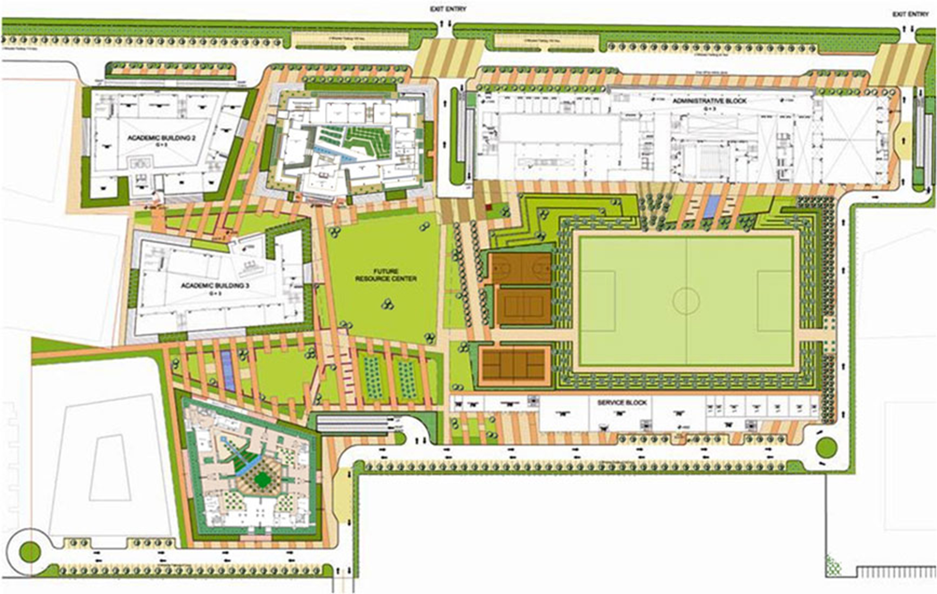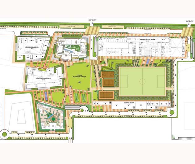 The master plan comprises of an academic building and a hostel block and network of walkways which connect the two. Different kinds of sports facilities happen along these walkways.