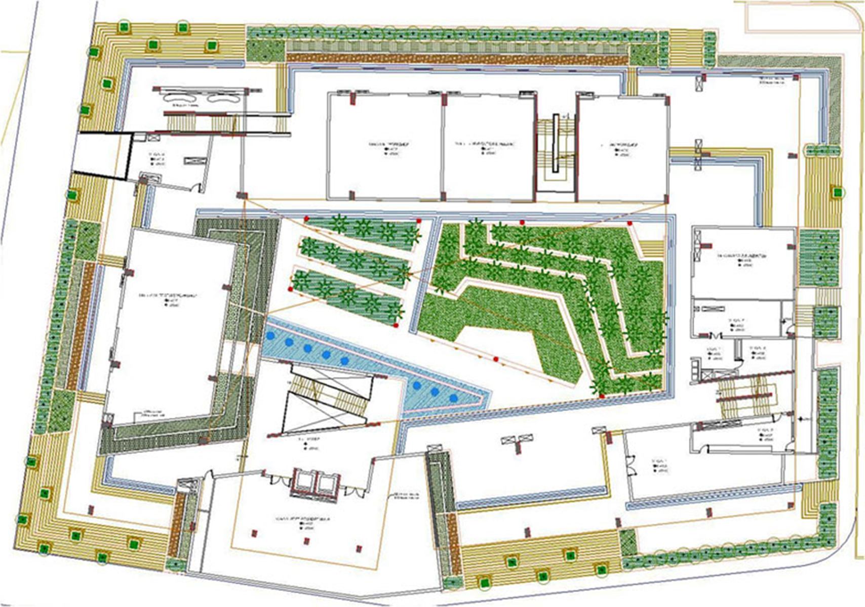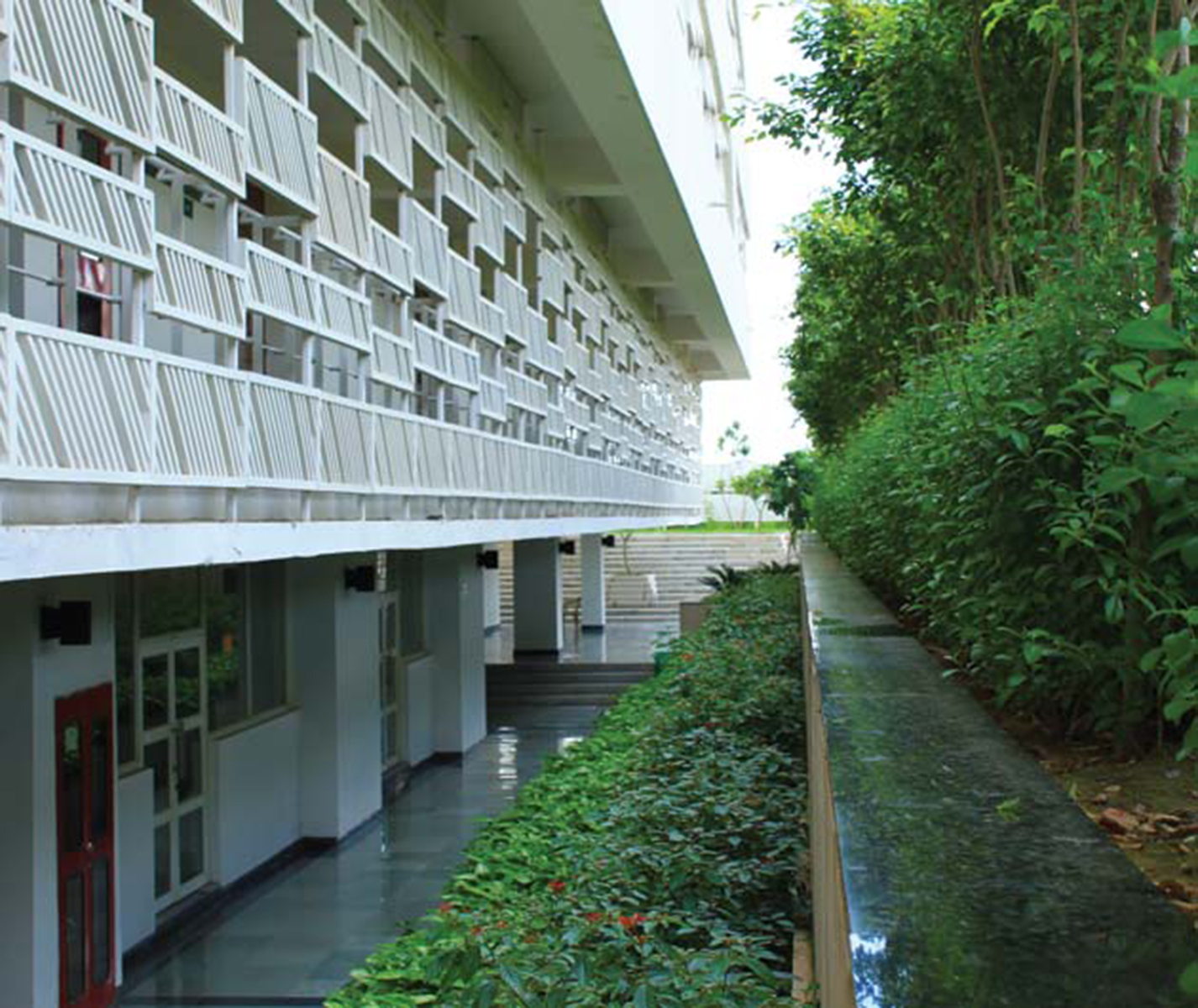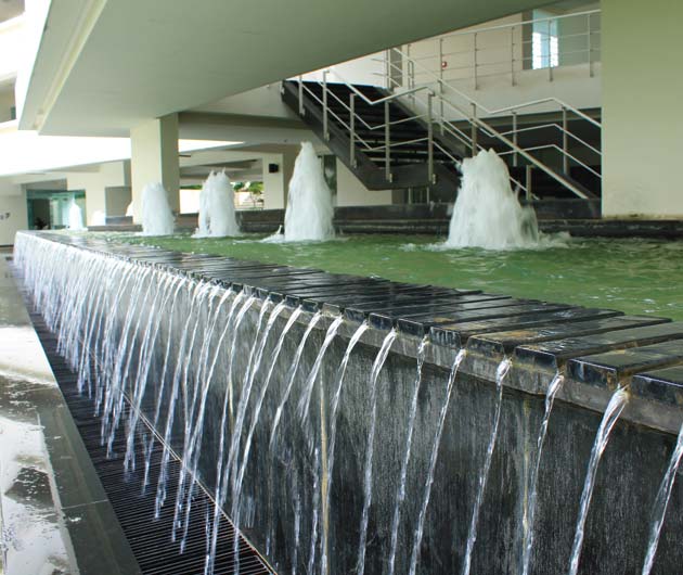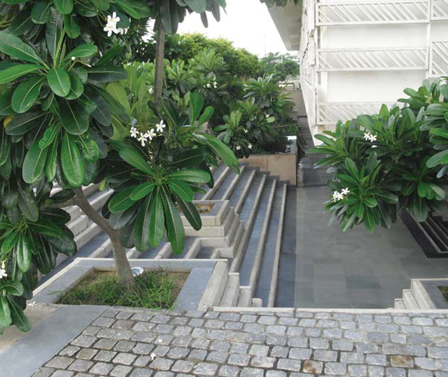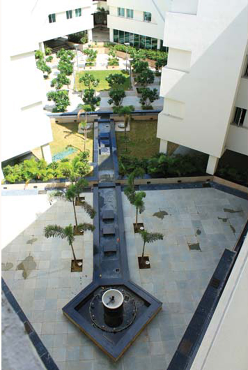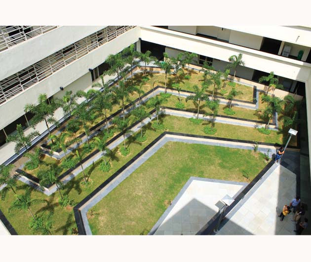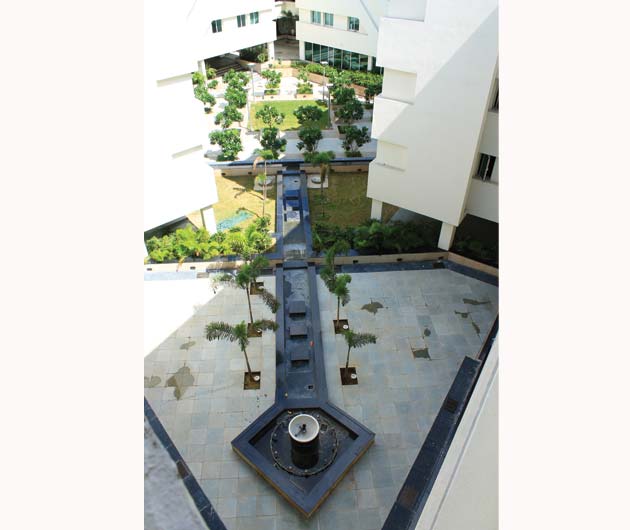 The architecture of the campus buildings makes use of the basement for a variety of recreational usages. It is referred to as “The Underbelly”. The landscape works in harmony with architecture. It celebrates the process of grade change for access to basement. An overflowing water body in the courtyard generates sound of water which echoes in the enclosed space and animates it. The planting is lush and dense. The hardscape is very stylish in response to architecture.