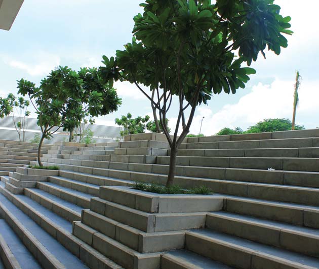 The landscape at Raffles University provides spaces for informal get-togethers, contemplation, recreation and enhances the visual qualities of the environment.